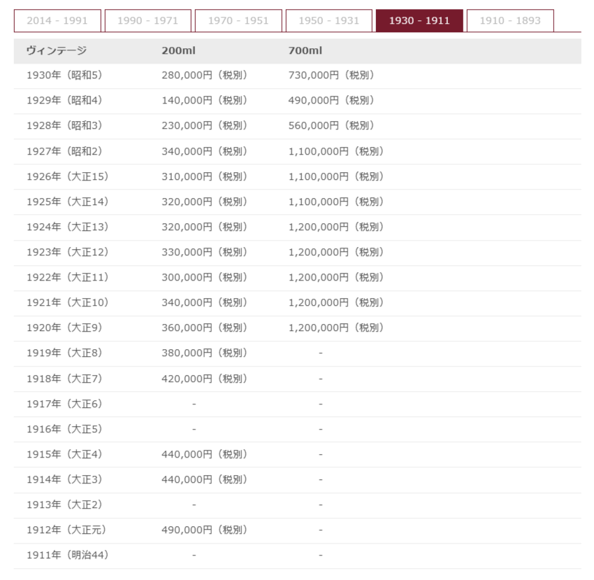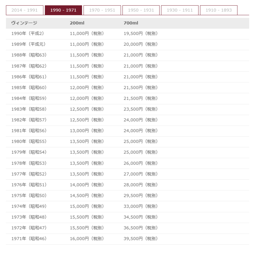 価格は各ヴィンテージで異なります。